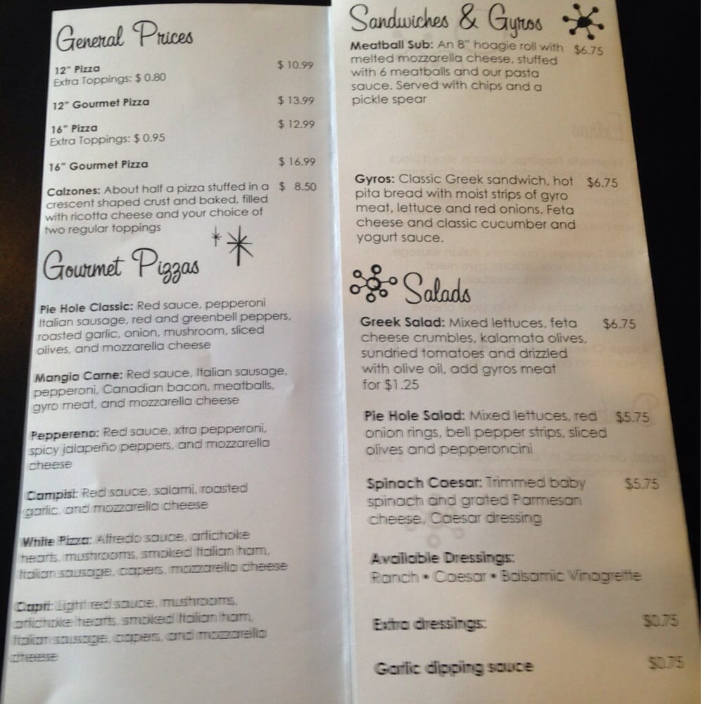 Indulge in highlights like the Pie Hole Classic Pizza, featuring a medley of savory ingredients topped with gooey mozzarella, or the meat-lover's Mangia Carne Pizza that satisfies the heartiest appetites. Pair your meal with a refreshing Greek Salad or the rich and creamy White Pizza.
